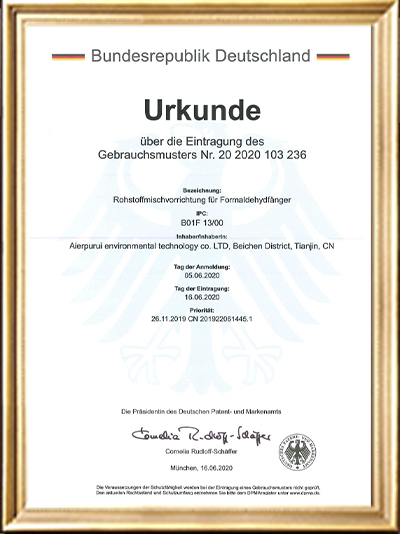 實(shí)用新型專利證書(一種甲醛清除劑的原料加載