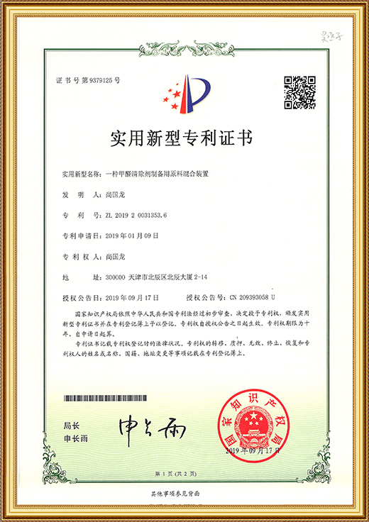 實(shí)用新型專利證書(一種甲醛清除劑的原料存儲