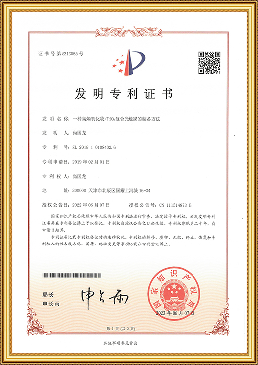 發(fā)明專利證書證書(一種高稿氧化物/Ti02復(fù)合光觸